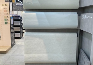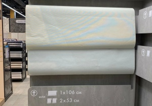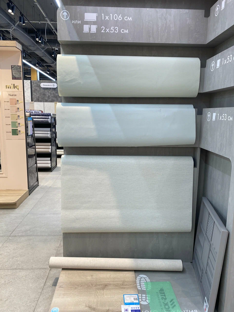 В магазине много удобных штук: наклеенные франменты обоев сверху, «примерочная» обоей с регулировкой освещения.