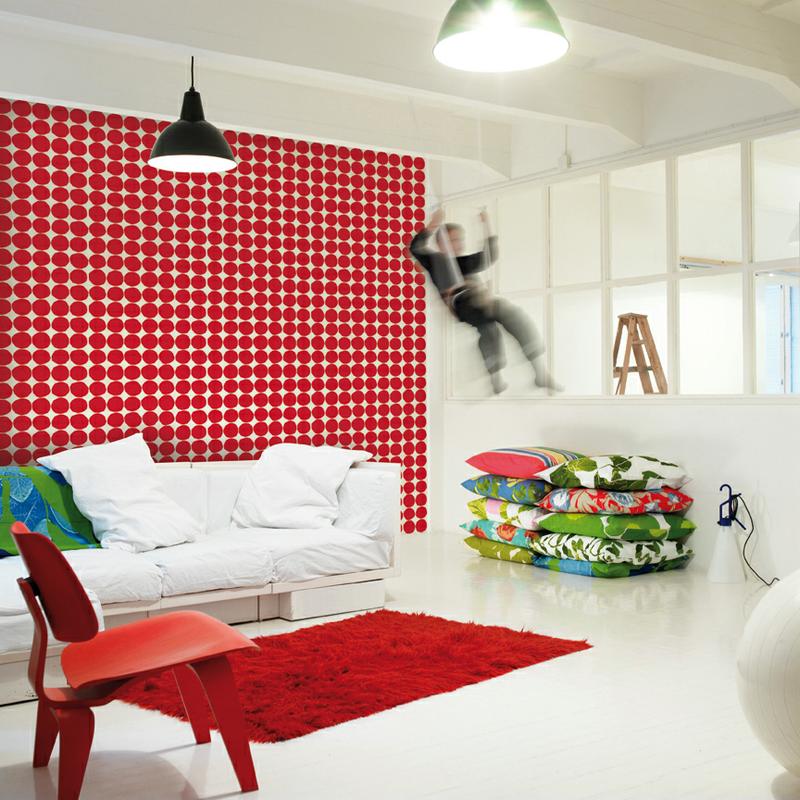 Marimekko — финская дизайн-студия, покоряющая мир броскими принтами с 1951 года. Широкую популярность марка получила, когда первая леди, Жаклин Кеннеди появилась на обложке спортивного журнала в их изящном розовом платьице. Под маркой Marimekko выпускаются наряды, предметы интерьера и посуда, заряжающая оптимизмом жителей малосолнечных северных стран и не только. Теперь яркие рисунки переместились на обои, которые печатаются на итальянской фабрике Sirpi.