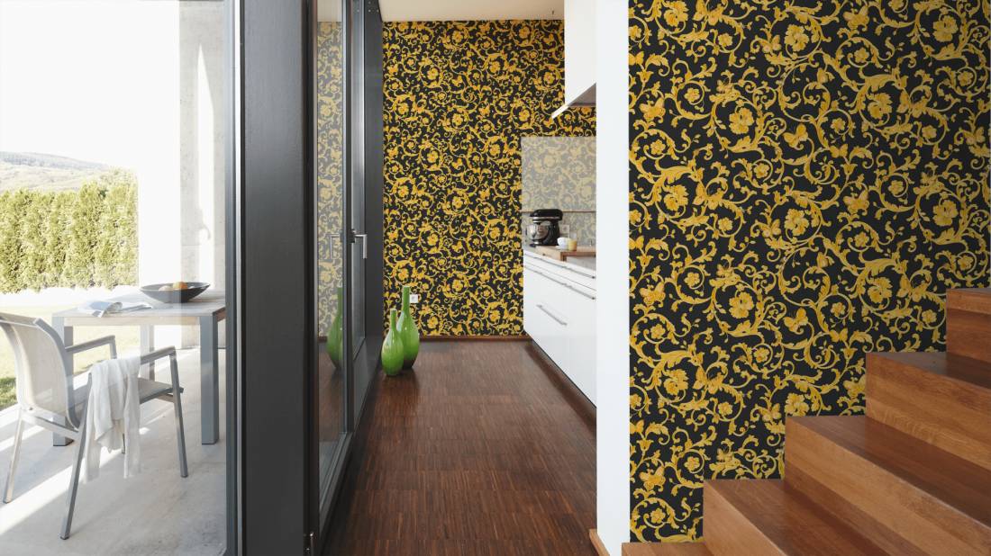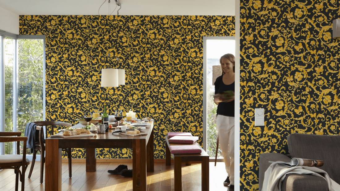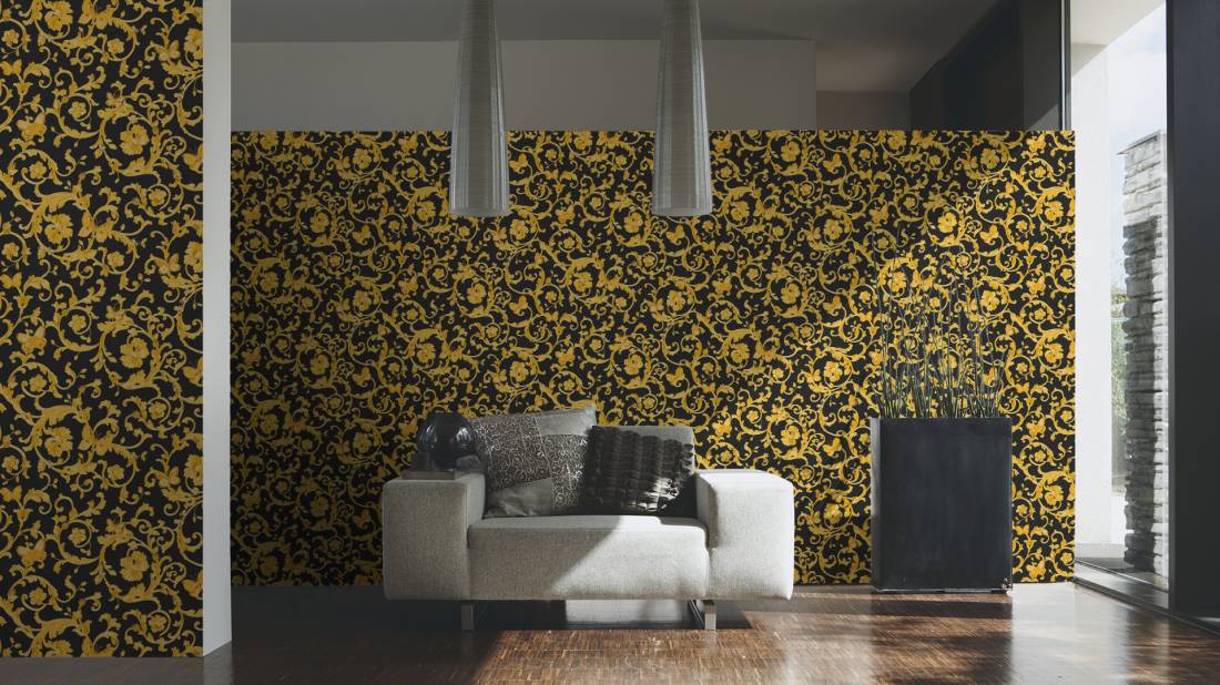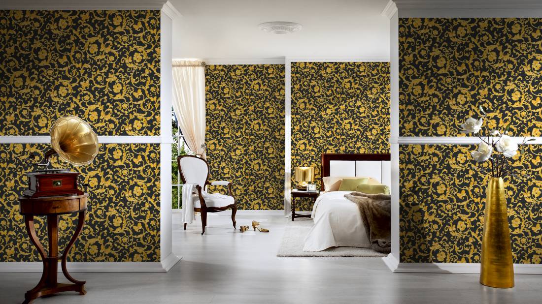 Великолепный набивной рисунок, много золота и дорогие материалы — это фирменный знак Versace, такой же, как и уже почти ставшие символом классики декоры Greek Key и Barocco.