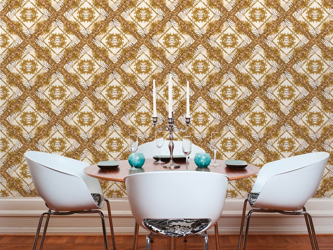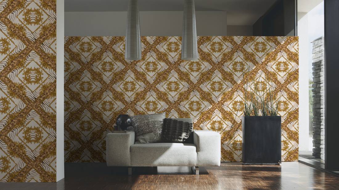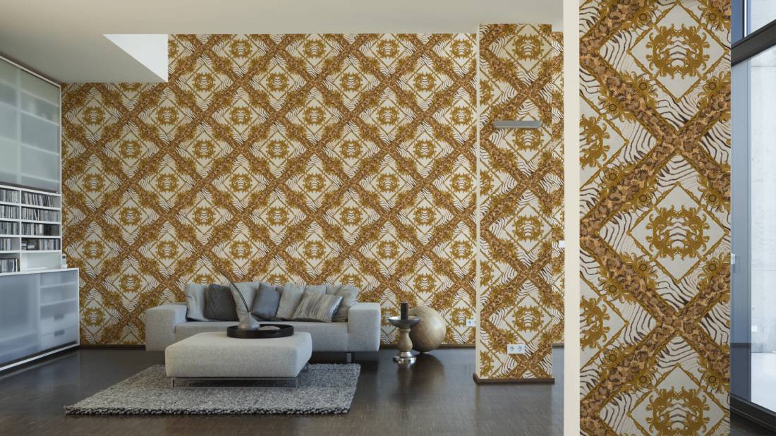 Великолепный набивной рисунок, много золота и дорогие материалы — это фирменный знак Versace, такой же, как и уже почти ставшие символом классики декоры Greek Key и Barocco.