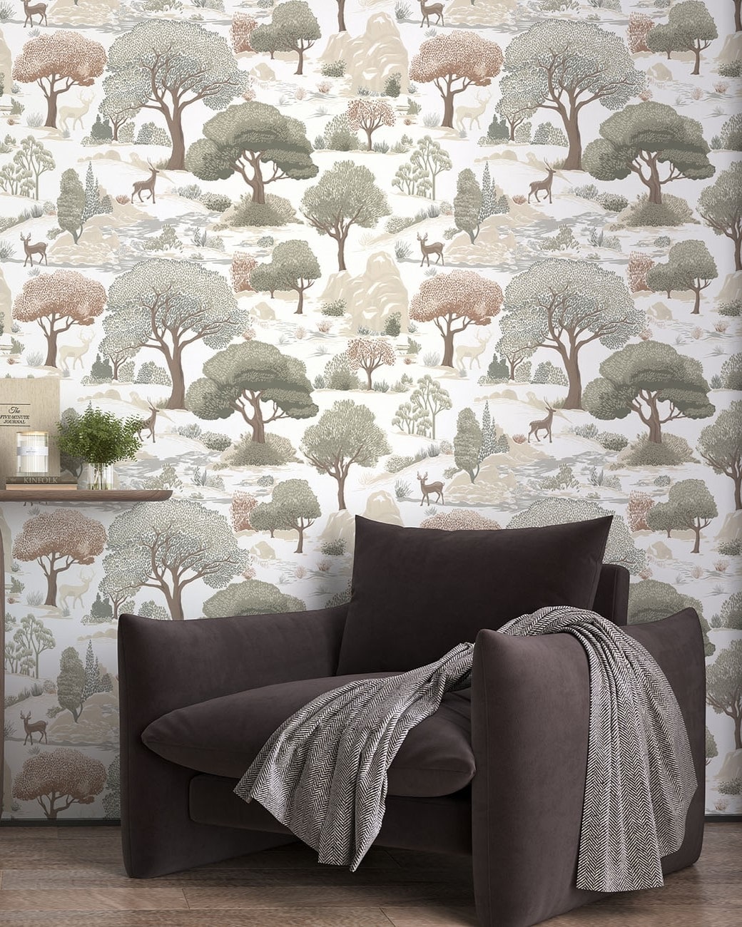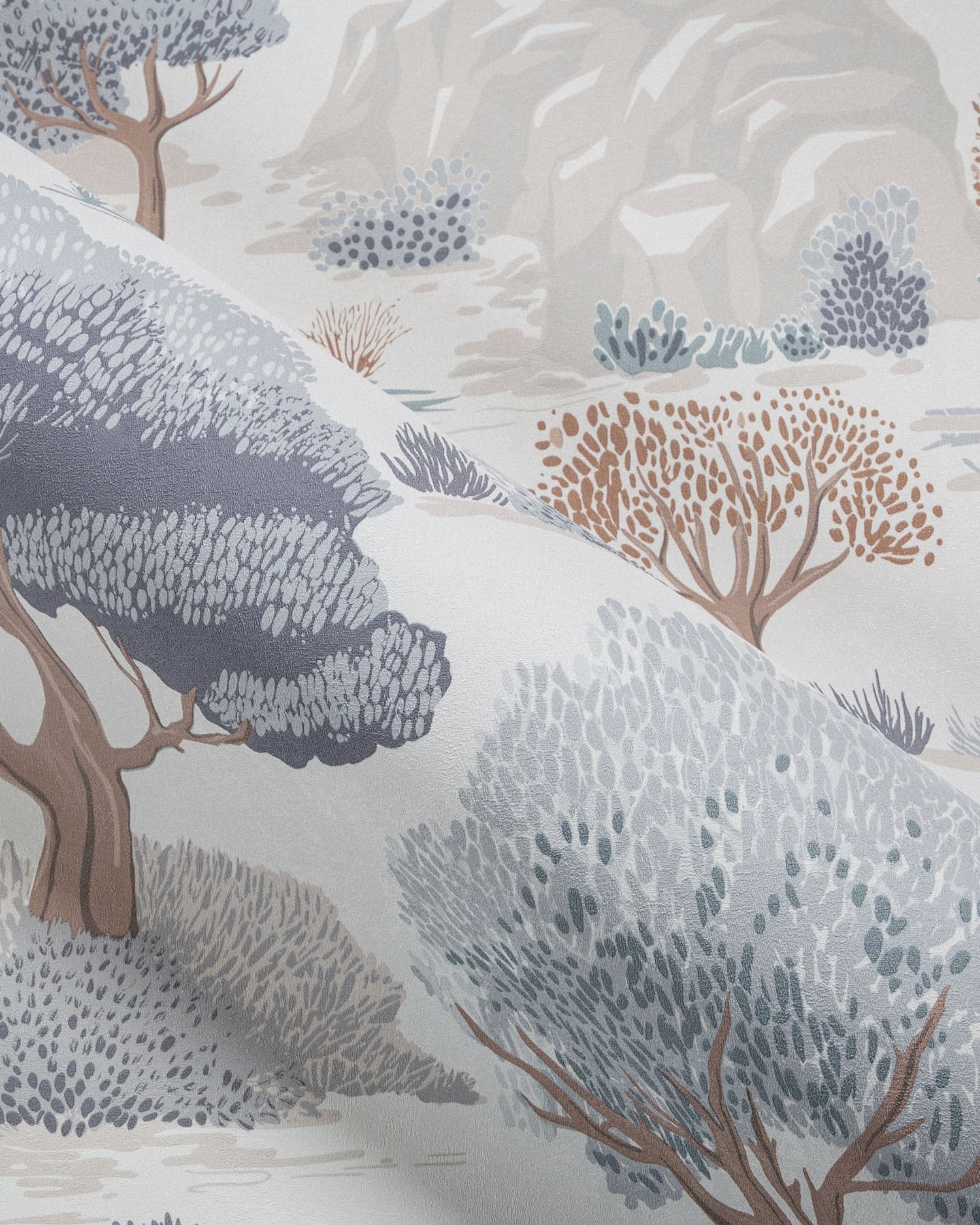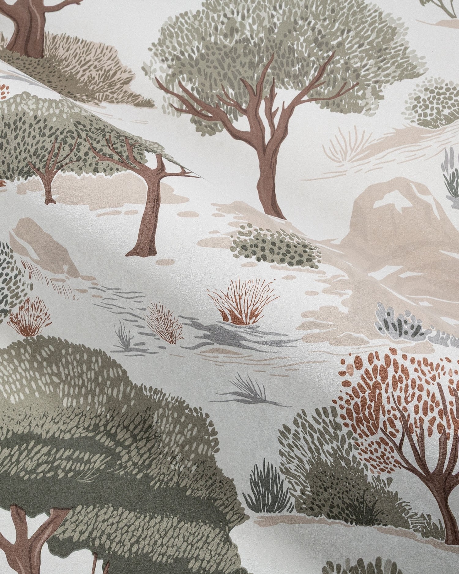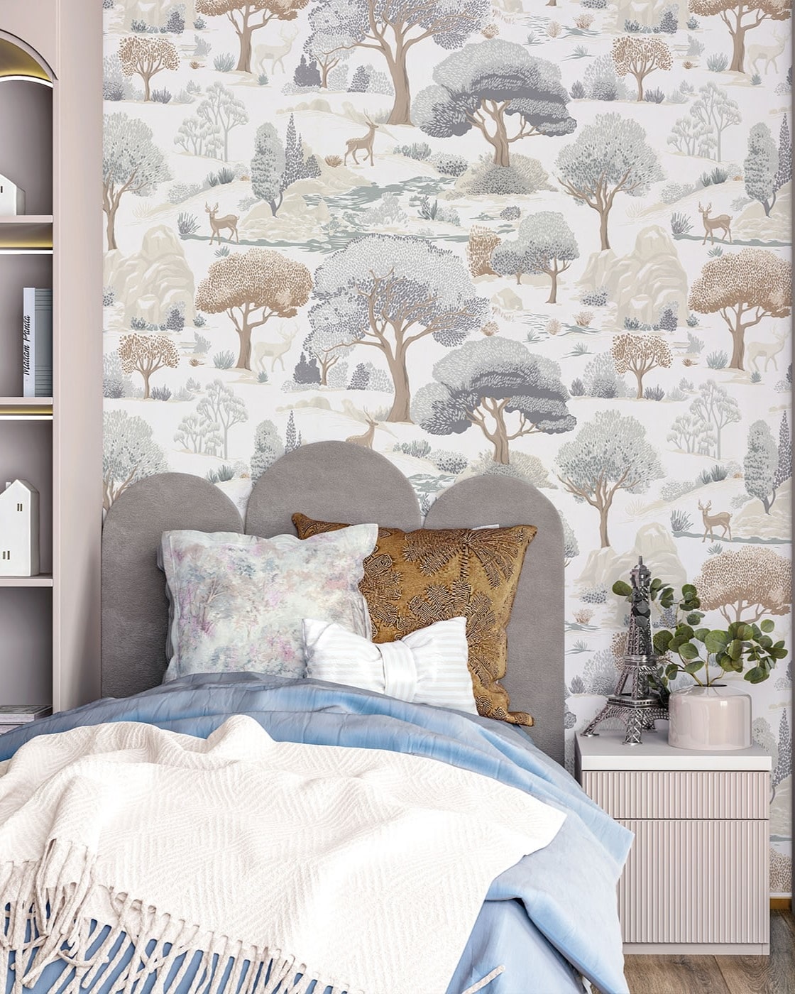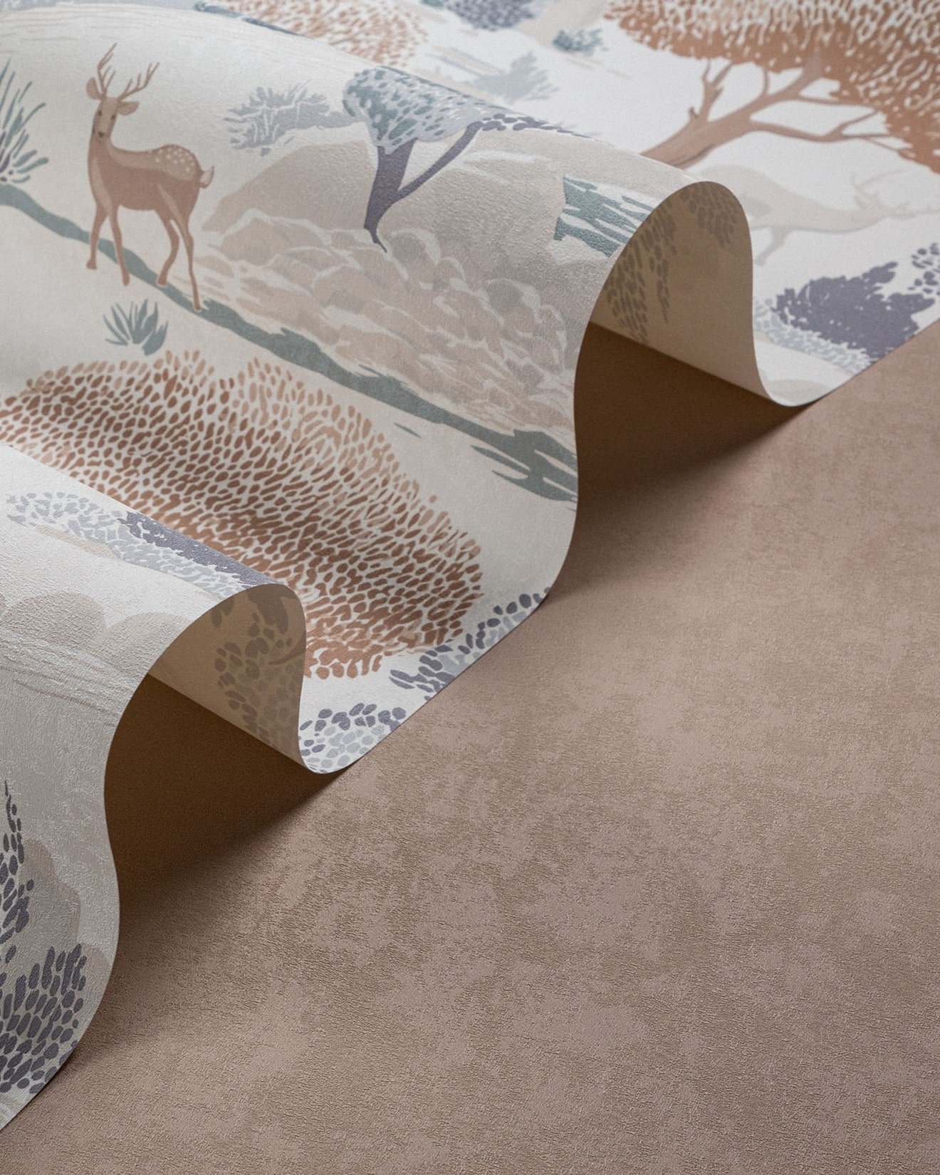 Kidzania — коллекция от Palitra Home. Обои вдохновлены скандинавскими интерьерами и выполнены в природных оттенках. Сюжет погружает в атмосферу волшебного леса: раскидистые деревья, холмы и изящные олени напоминают об иллюстрациях из детских книг.