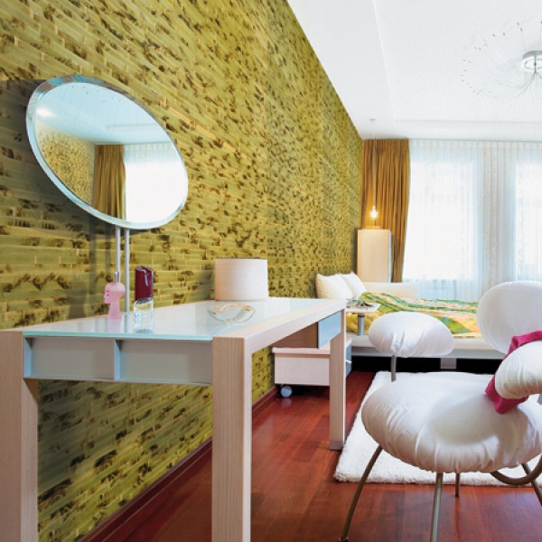 Работа с натуральными обоями не требует высокопрофессиональных навыков, однако поклейкаимеет определенные нюансы. Помимо острого ножа, кисти, валика и емкости для разведения клея, необходимо купить клей для тяжелых обоев (подойдет клей для флизелиновых обоев). Это очень важно: обычный клей может не справиться с толстым полотном натуральных обоев и они местами отойдут от стены. Также следует запомнить, что натуральные обои нельзя изгибать при поклейки углов, полотно может потрескаться. Для того, чтобы оклеить угол, необходимо разрезать полотно на две части. Следите за тем, чтобы клей не попал на лицевую сторону полотна: натуральные обои не любят прямого попаданиявлаги и не очень хорошо поддаются чистке и влажной уборке. Излишки клея с тыльной стороны также не пойдут на пользу, они могут вызвать отслоение основы от полотна и деформацию обоев. Запомните, что поперек полотно нужно резать только ножом, а вдоль ножницами.